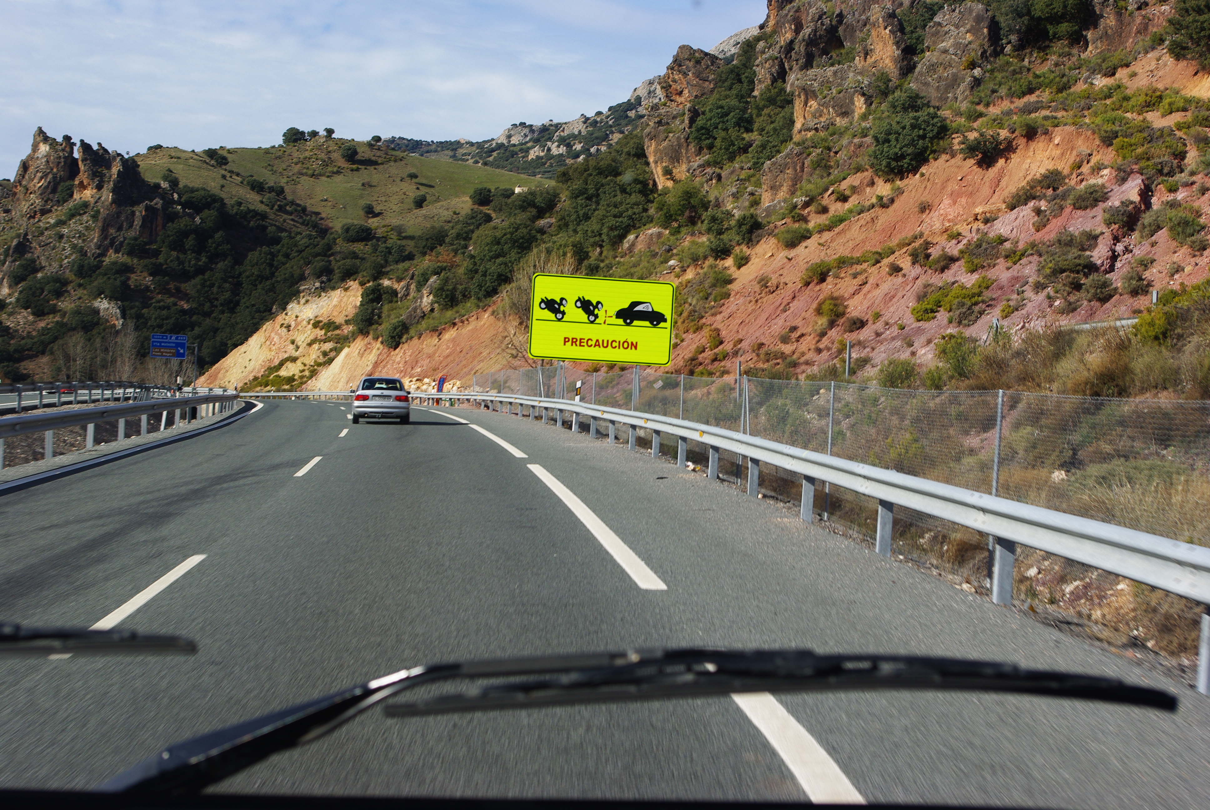 Pour rejoindre Algeciras, le GPS nous entraine sur une autoroute en plein coeur des terres. Le paysage est désertique, limite angoissant ; il nous rappelle certaines scènes de westerns mexicains : champs envahis de cailloux, montagnes rocheuses, végétation rare, de ci de là quelques monticules de terre qui cachent…une habitation troglodyte ! Notre autoroute nous entraine à plus de 1300 mètres d’altitude ; la vue sur les plaines est magnifique. Ces 400 Km ne nous auront rien couté : l’autoroute est gratuite contrairement à celle de la côte. Cependant, au retour, nous privilégierons la côte par crainte de mauvaises conditions de route.