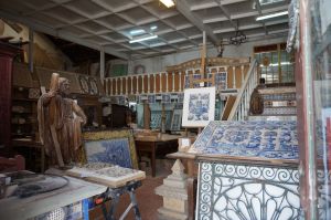 La chaleur écrasante ne réussissant pas à réduire notre gourmandise, nous cherchons la pasteleria Luis da Rochas. Cette pâtisserie est une institution ! Elle tient le haut du pavé depuis 1893 ; le décor est très « année 1950 ». Déguster une douceur devient un moment d’anthologie ! La rue qui nous conduit dans ce haut lieu de la gourmandise est ombragée par de grandes toiles tendues de part et d’autre. Pratique pour le challant mais désespoir du photographe ! Comme souvent au Portugal, nous manquons de recul pour photographier une belle façade, les rues en pente ou les bâtiments de guingois donnent l’impression que la photo est tordue ! Nous découvrirons quand même une magnifique cheminée maure qui tient lieu de barbecue.