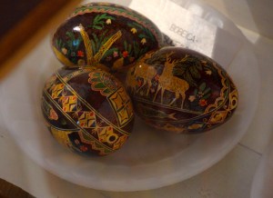 C’est aussi la région des œufs peints ! Les œufs sont vidés de leur contenu, puis peints à l’aide de la chisita, un tube de métal sur lequel est tendue une soie de porc. Dans un premier temps, la coquille vide est enduite de cire colorée, puis les motifs sont dessinés et les couleurs fixées par des bains successifs de la teinte la plus claire à la plus foncée. Le plus souvent la couleur est rouge. Chacun a son motif particulier. Ils sont souvent offerts à Pâques et donnent lieux à des concours. Il s’agit en faisant rouler son oeuf de casser ceux des concurrents ! Pour les enfants, les oeufs sont en bois. Moins fragiles, ils permettent aussi de casser les oeufs des adultes sans coup férir !