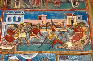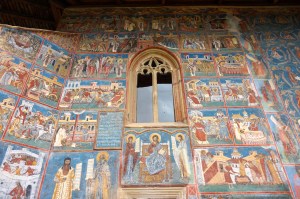 Les peintures de Voronet sont à dominance de bleu, un bleu encore bien différent du bleu éclatant de Sapanta. Le bleu de Voronet serait obtenu par broyage de lapis-lazuli ! La résistance au temps est assez exceptionnelle !