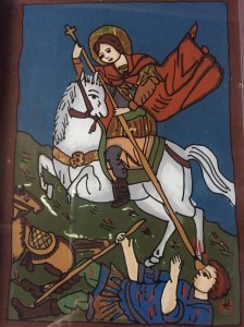 Grâce à un vendeur d’icônes sur verre qui parle très bien le français, nous aurons plusieurs informations sur la Roumanie. Il nous parle de son art. Les icônes sont peintes à l’envers et les diverses teintes sont superposées avec minutie. Plus le dessin est fin, plus les passages sont nombreux. C’était un art religieux. Pour autant, dès le 17° siècle, les paysans ont commencé à peindre des icônes pour protéger leurs maisons, d’abord sur verre, puis sur bois, le verre étant devenu trop cher. Les icônes représentent de façon naïve des saints vêtus de costumes traditionnels ainsi que des éléments de la vie quotidienne.