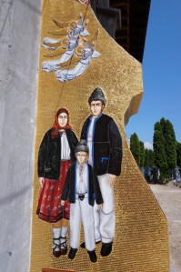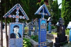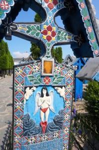 Nous poursuivons en direction du centre-ville pour rejoindre le cimetière joyeux. Nous payons un droit d’entrée et le ticket se matérialise sous la forme d’une…Carte postale ! Le cimetière est une forêt de croix d’un bleu éclatant. Elles sont en bois et ont été sculptées par Ion San Patras, puis ses apprentis. Depuis 1935, chaque défunt du village a droit à sa croix qui, au resto, retrace une caractéristique avouable du défunt accompagnée d’un poème de quelques vers et au verso , le côté sombre du défunt. Ainsi la croix du boucher : au resto , il est à son étal, au verso, il est ivre mort ! Autre exemple : la paysanne traie sa vache au recto et se révèle de petite vertu, entourés d’hommes aux mains baladeuses au verso. Franchement, nous avons beaucoup ri dans ce cimetière !!