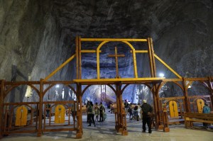 Nous voici à Praid pour visiter la mine de sel, encore en exploitation depuis l’Antiquité. Un panneau annonce que le sel contenu pourrait fournir toute l’Europe ! Tout d’abord un bus nous emmène à 120 mètres sous terre après une descente de 2 KM. Il y a foule. Les mines ont été transformées en centre de traitement des maladies respiratoires. Pour que la cure fasse effet, il faut rester 4H sous terre. Le temps peut sembler long…Pas à Praid ! Nous parcourons un décor hallucinant à la Jules Verne : salles immenses contenant des boutiques, des jeux d’enfant, des aires de pique-nique, des restaurants, des bars, un cinéma 3D, une église, un musée et tout ceci équipé en wifi ! Une véritable ville souterraine où nous avons déambulé pendant… 2 heures, tant nous avons perdu toute notion du temps ! La température est agréable, l’hygrométrie supportable…Reste un goût salé sur la peau lors de notre sortie des entrailles de la mine.