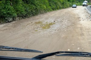 La rivière a emporté une partie de la route ! Nous slalomons entre les trous, roulons en deuxième, sur des blocs de pierres directement issus de la rivière pour aboutir face à un pont sous lequel…Nous ne passerons jamais ! Sa hauteur est de 2,10 mètres et celle de notre véhicule de 3,05. Consternation ! Stupeur ! On ne va quand même pas refaire tous les kilomètres de « gaz » ??? Un Roumain nous vient en aide dans un bon français : « prenez tout de suite à gauche après la voie ferrée. Il y a un petit bout un peu dur mais après c’est tout bon. Çà passe. » çà passe ? Mon œil !!! Nous avons beau chercher le passage, ausculter le terrain, inspecter à pied…Impossible de franchir en toute sécurité les fondrières remplies de boue.