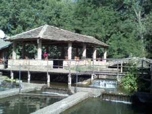 Ainsi nous voici à 11h, à Benjë Novosolë, aux sources chaudes, par quasi 40° sans un brin d’ombre…. Ici se tenait une station balnéaire réputée qui est tombée en ruine avec la chute de la dictature communiste. Il reste de grands bassins naturels où les Albanais se baignent après s’être enduit d’une glaise aux vertus bienfaisantes.