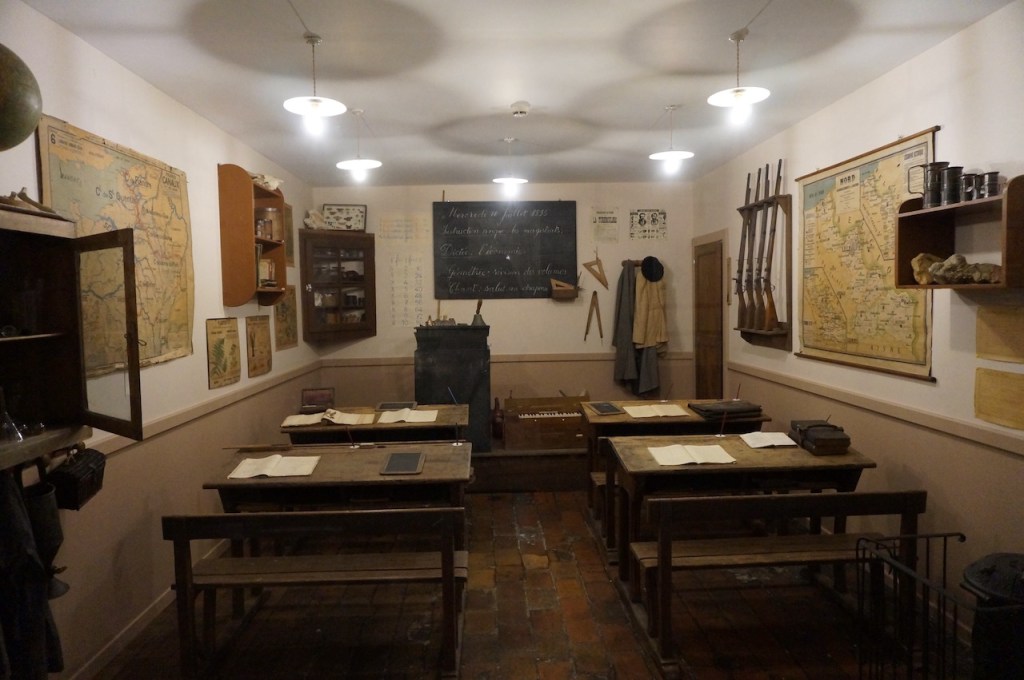 Dans la salle de classe de 1895, des fusils sont accrochés au mur. Curieux … Ils symbolisent la France revancharde de 1870 à 1914.