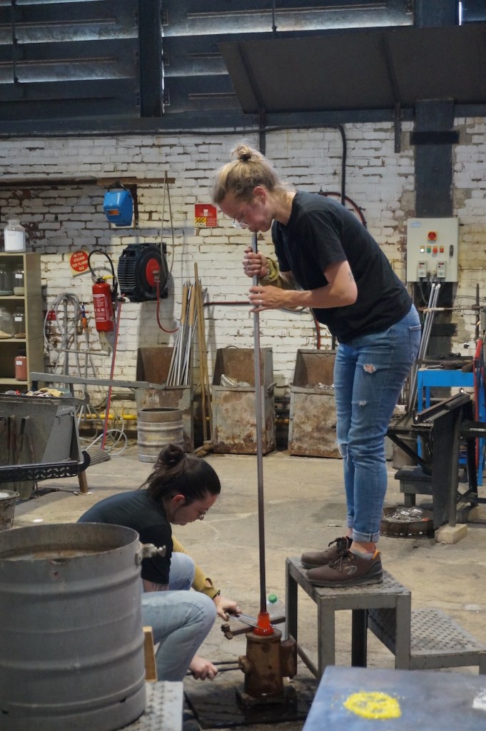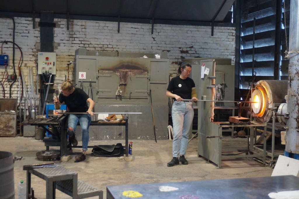 Ici encore, nous sommes les seuls visiteurs et l’accueillant nous emmènent directement vers deux verrières qui soufflent un vase dans une chaleur effroyable. Nous avons le temps de discuter avec elles.