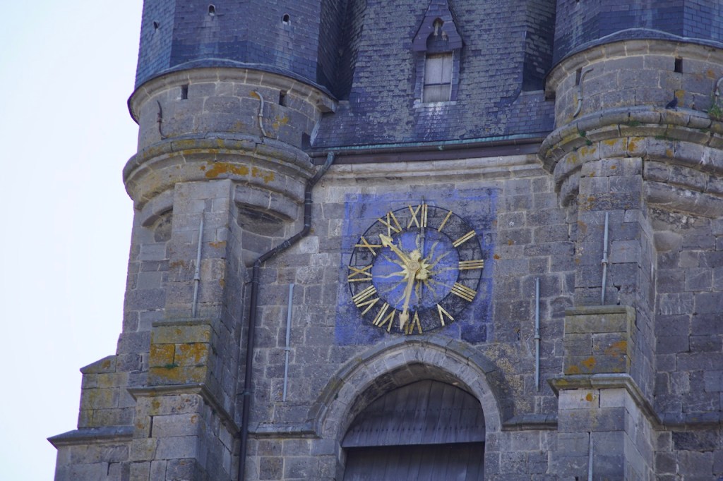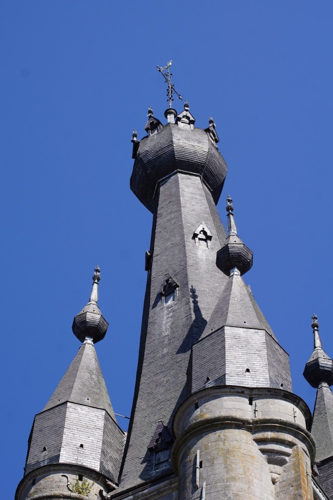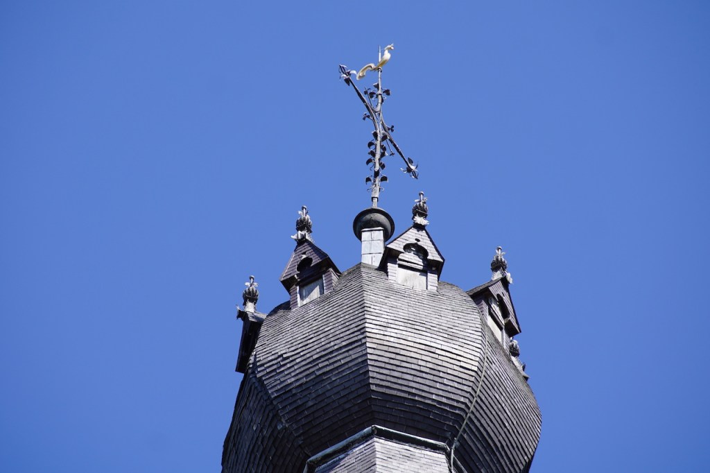 La flèche est ornée d’échauguettes en fuseau et couronnée d’un bulbe à lucarne où se tenait un guetteur !