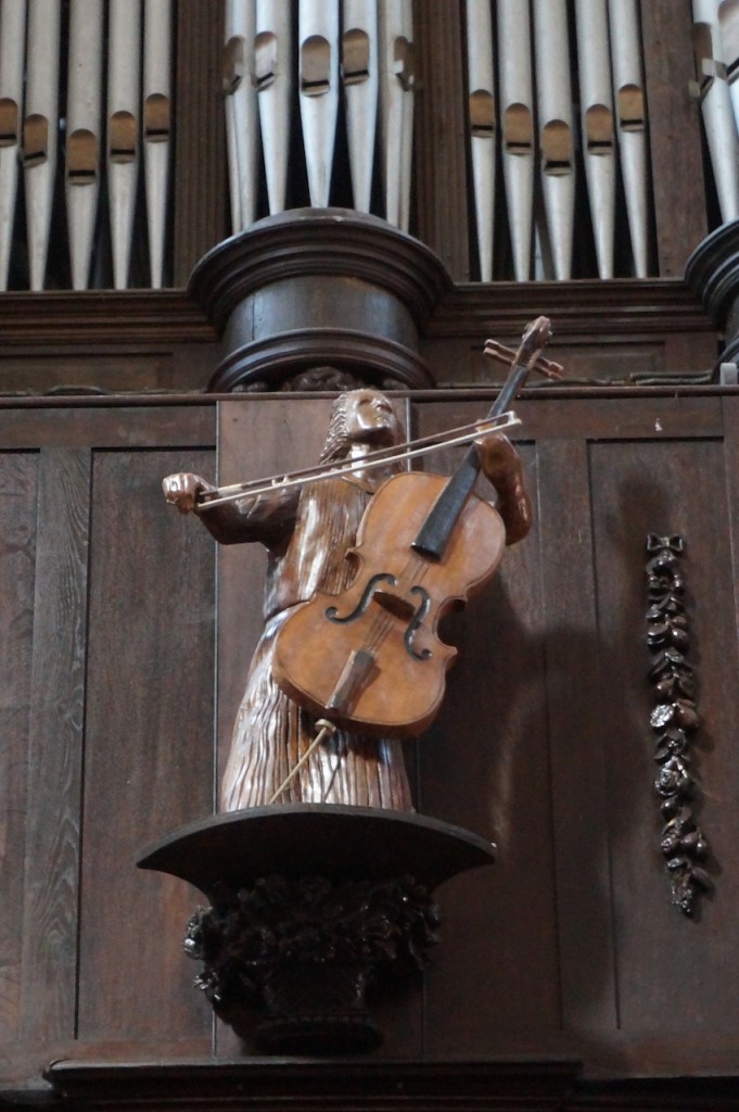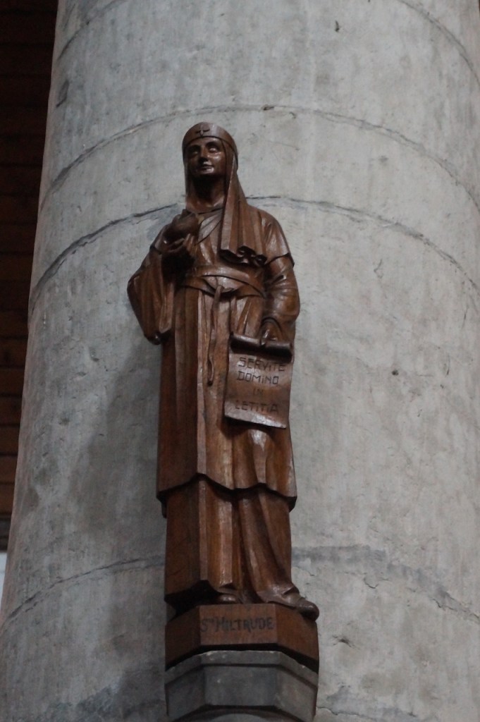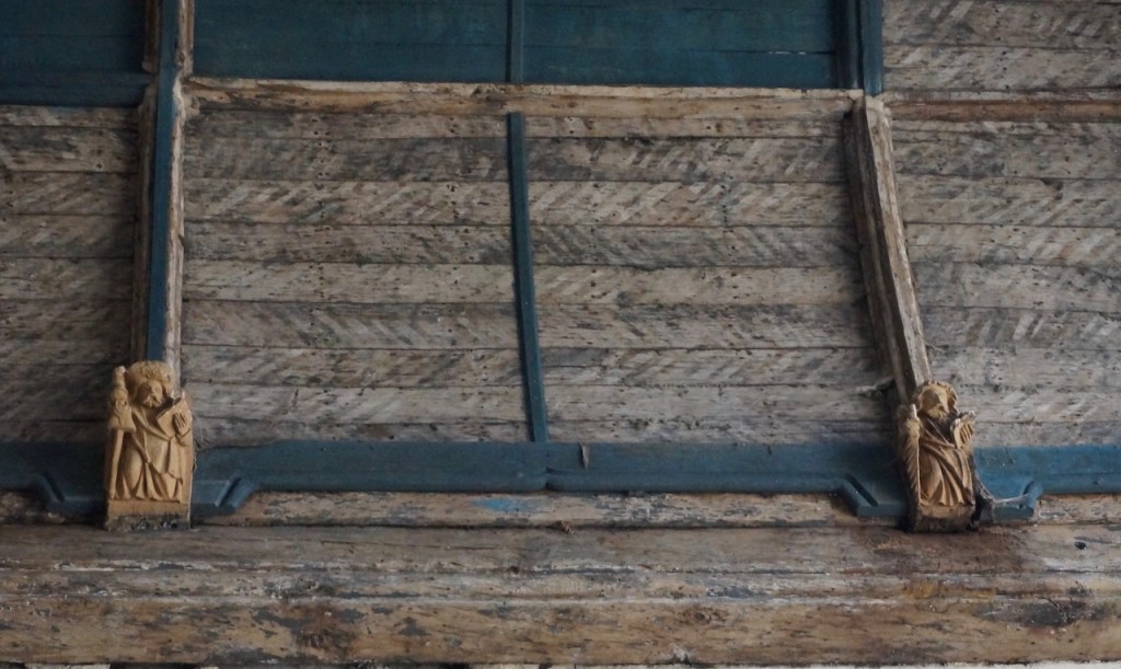 A l’intérieur de l’église, nous aurons aussi la sensation d »être observés par ses curieuses têtes au bout des poutres du plafond et la statue du saint patron.