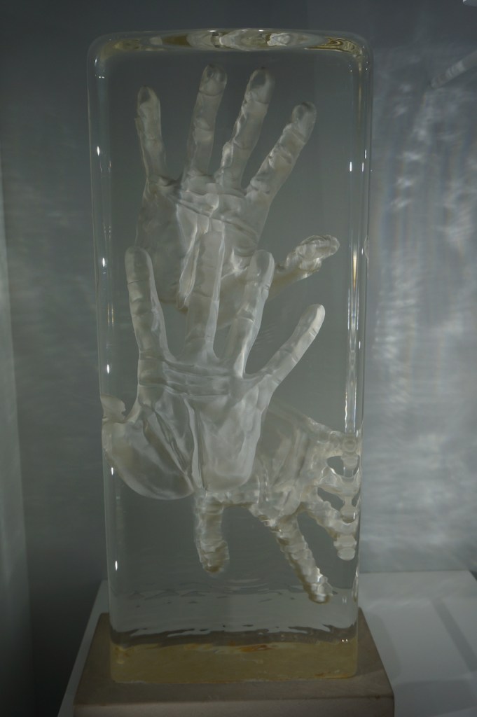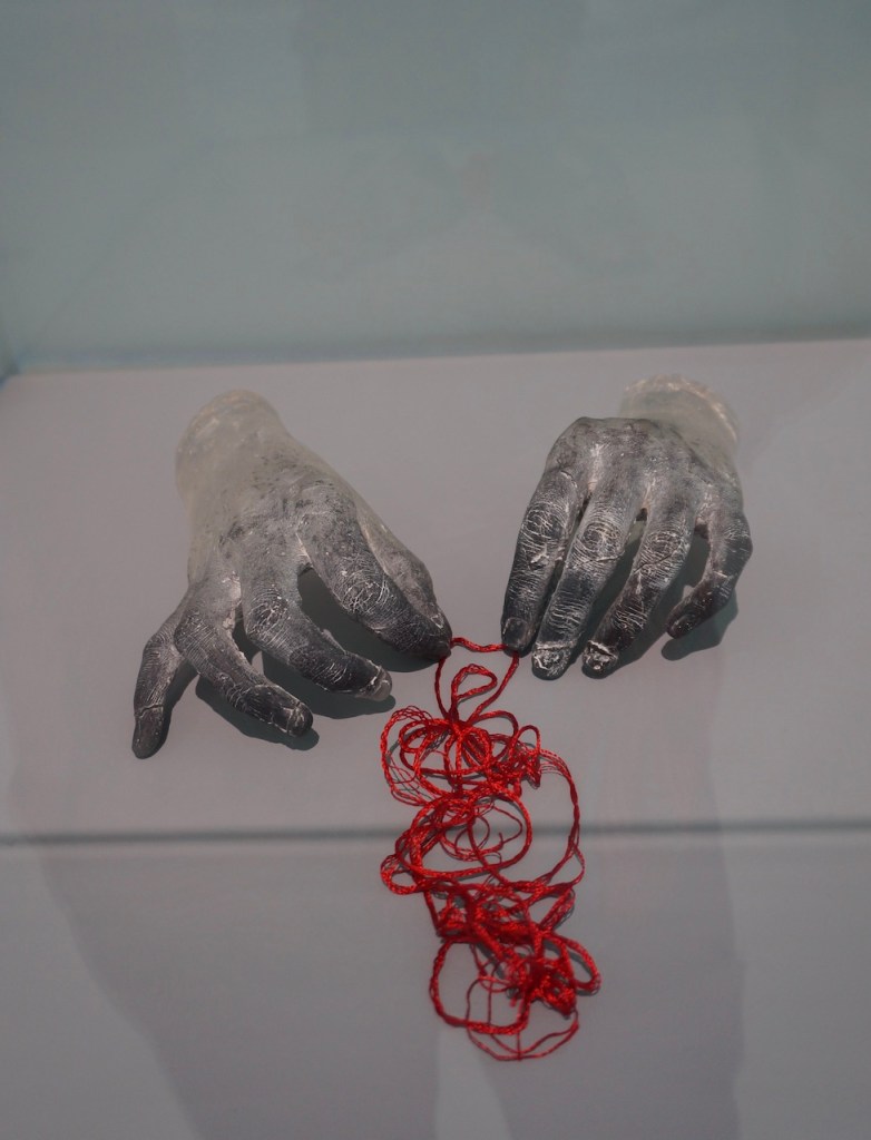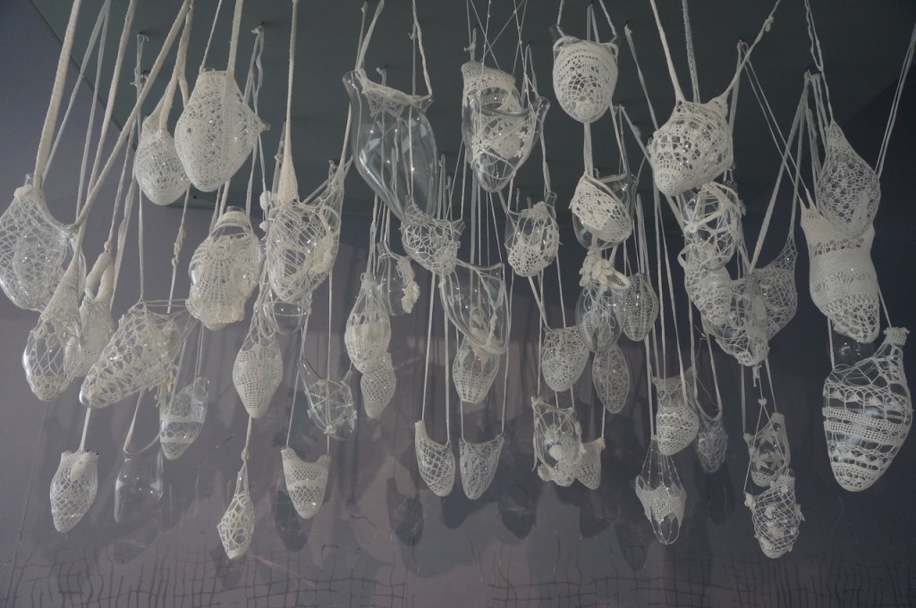 Dans l’exposition temporaire, le travail des mains est valorisé par les artistes ainsi que celui du textile. Ne sont-elles pas réalistes ces mains qui filent la laine en verre,…