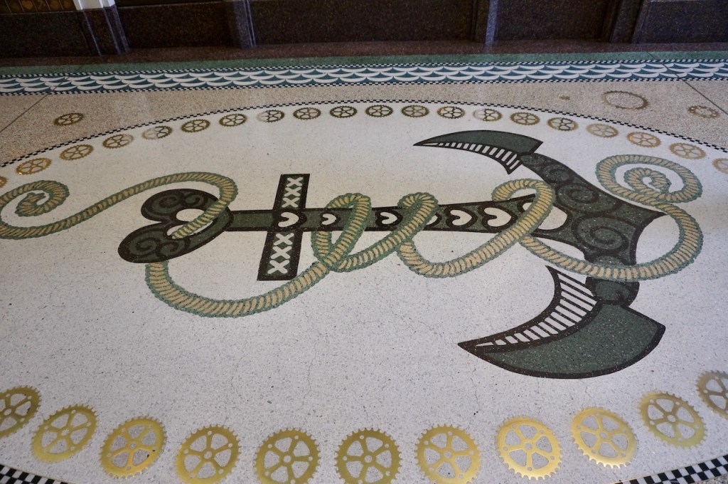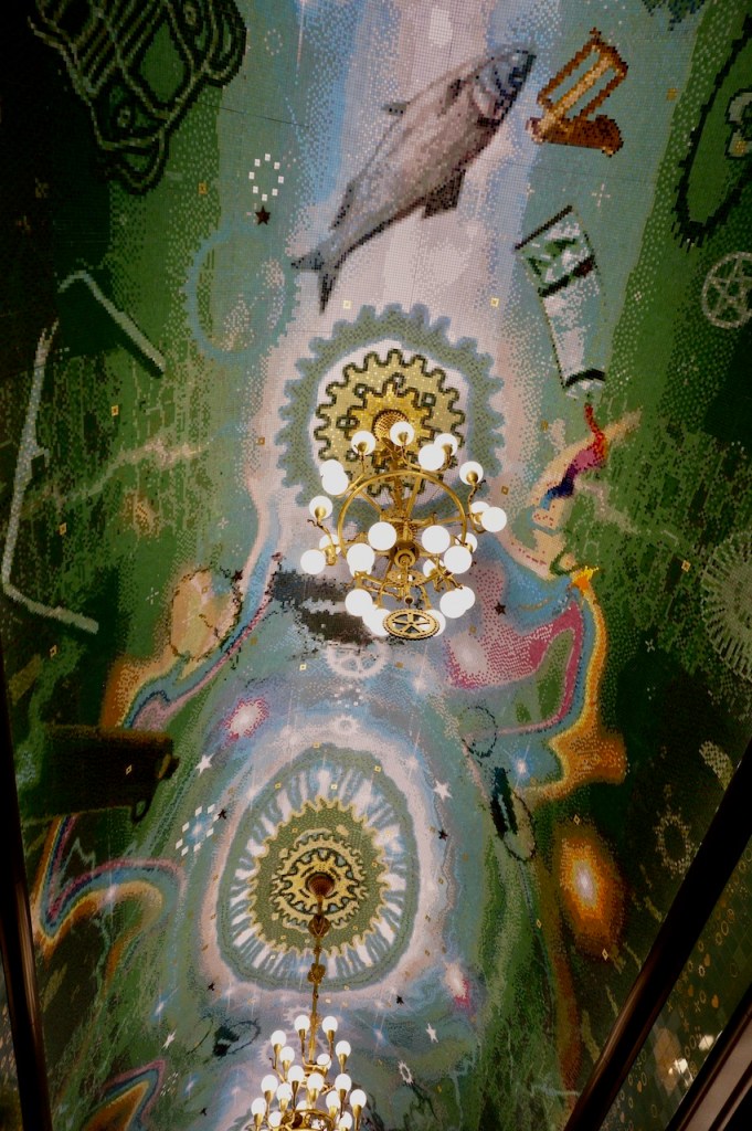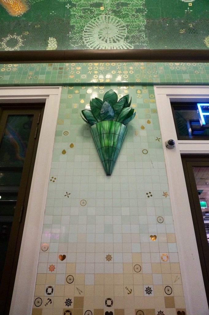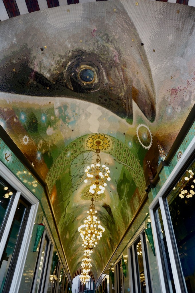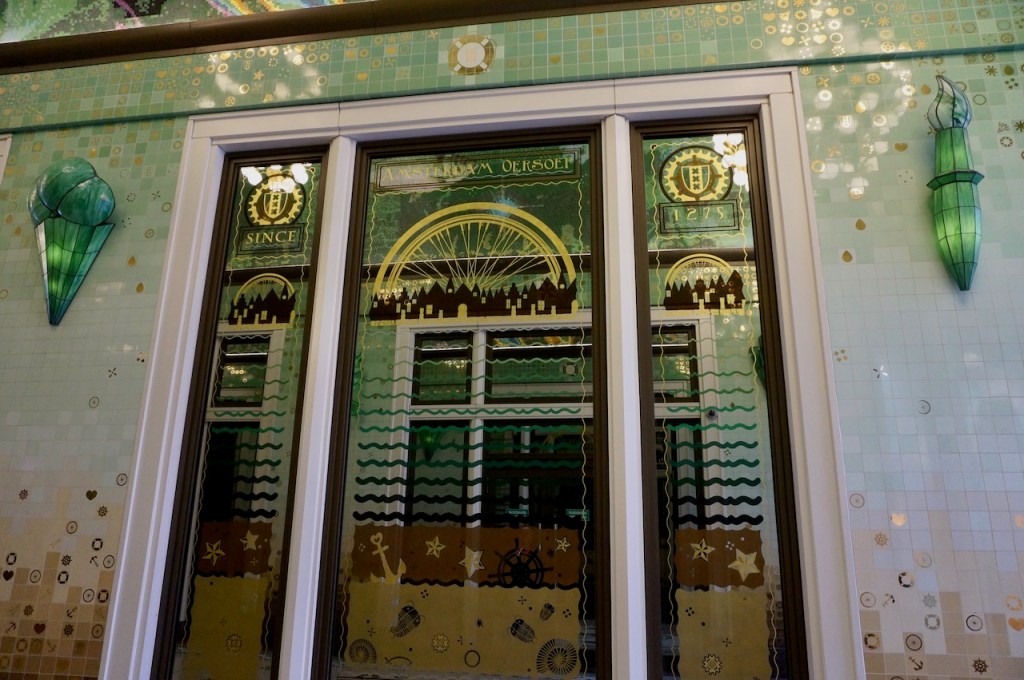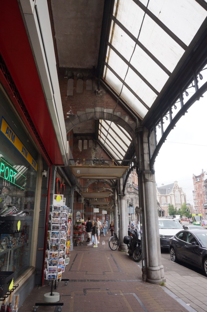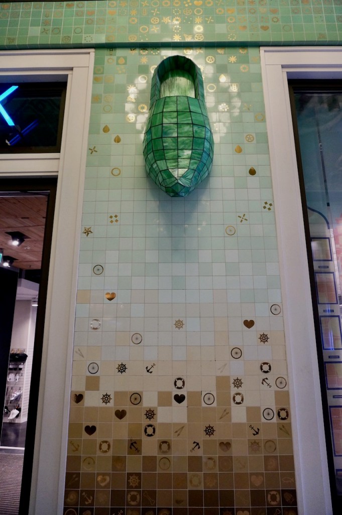 Sur Damrak, nous nous engageons dans un passage étonnant, tout en mosaïques et incrustation de roulements en cuivre, il est dédié à l’eau et au monde marin ! Seules certaines appliques rappellent les emblèmes des Pays-bas : tulipe et sabot ! On a adoré !