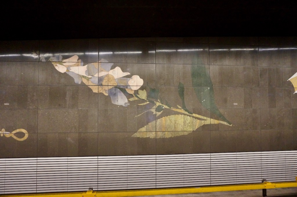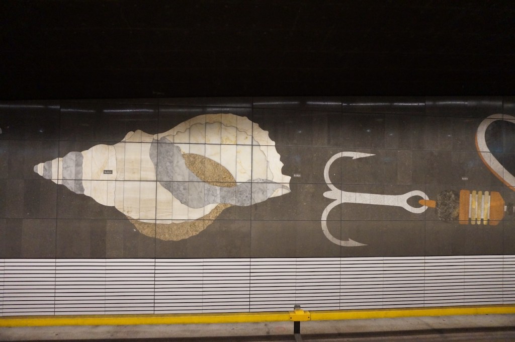 La station de métro du Rokin est décorée d’oeuvres en marbre et pierre incrustés, véritable marqueterie minérale.