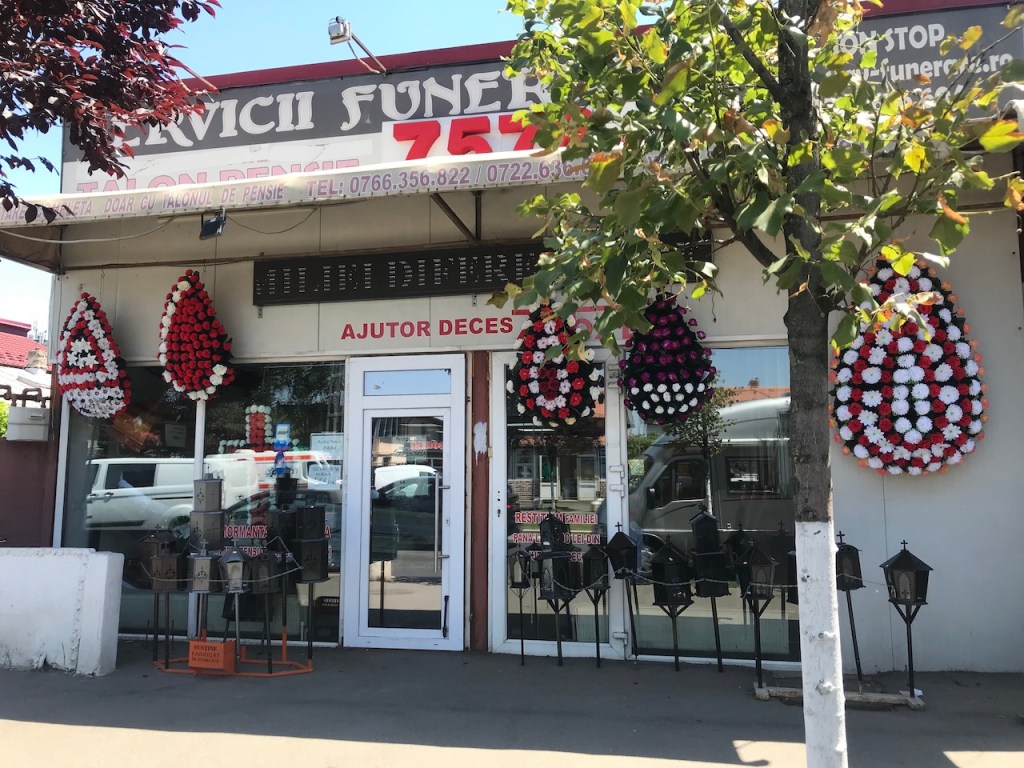 Nous sommes bien en Roumanie et retrouvons ces boutiques de pompes funèbres qui n’ont cesser de nous étonner tant elles diffèrent des nôtres.