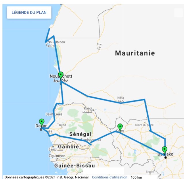 Le GPS routier est censé fonctionner en traceur ; il pointe le cap et navigue selon les waypoints que je lui ai rentrés. Encore faut-il trouver le bon écran ! Plusieurs tripatouillages seront nécessaires. Nous arrivons, enfin, devant l’ambassade de Mauritanie ! La porte du « bureau » s’ouvre. Une bousculade monstre cause le courroux du préposé : « un par un ! Tout à la queue! ». Il faut jouer des coudes et écraser des pieds pour garder sa place en lançant un regard noir et parfois une invective ; Nous voici dans la place et là….