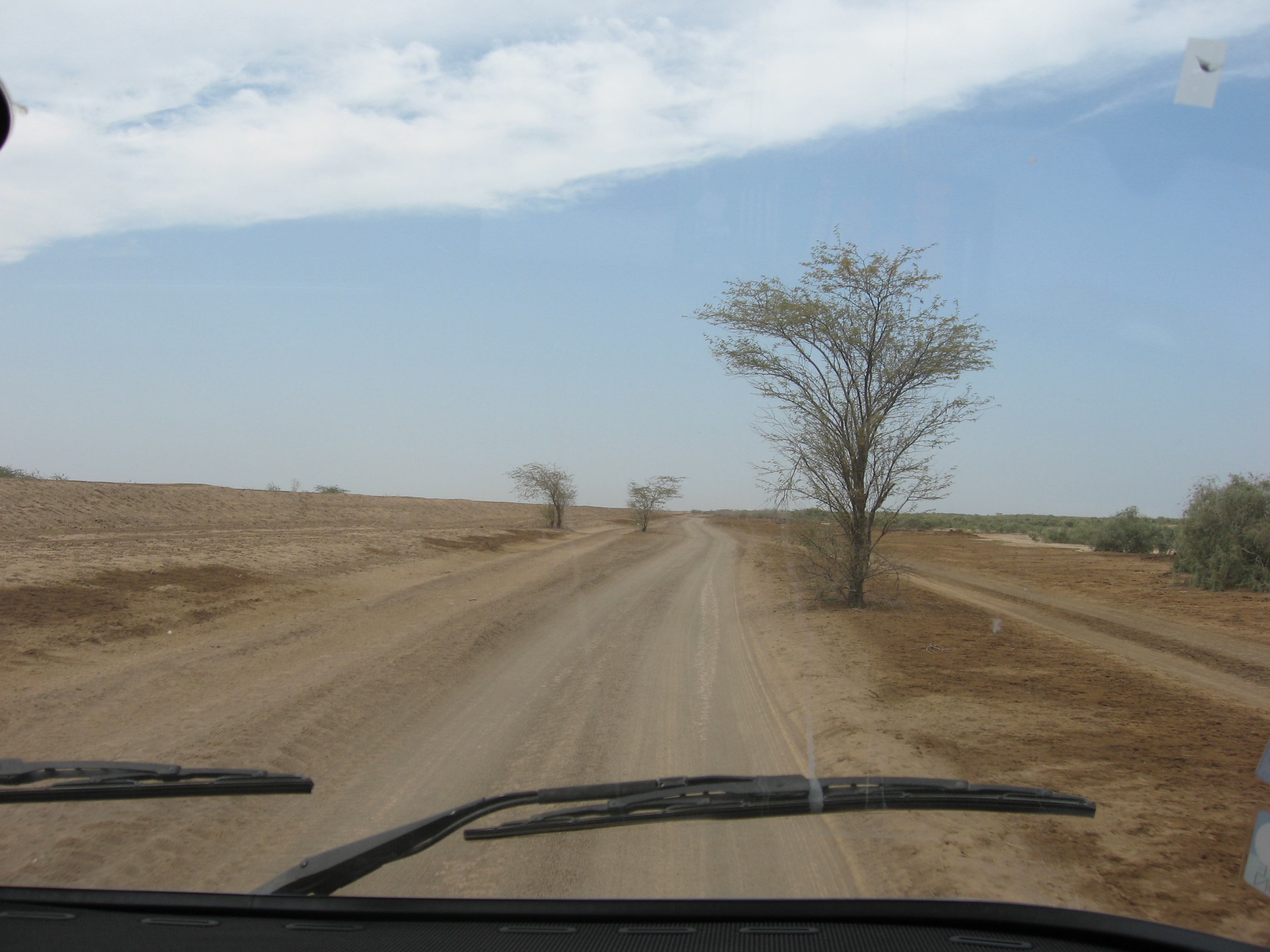 Le trafic est dense : énormes bâchés à fond de leurs moteurs rugissants, camionnettes roulant « en crabe », vélos, charrettes… le tout disparaissant dans un brouillard de sable hyper dense. Là, on comprend le 1er souhait de bonne chance.
