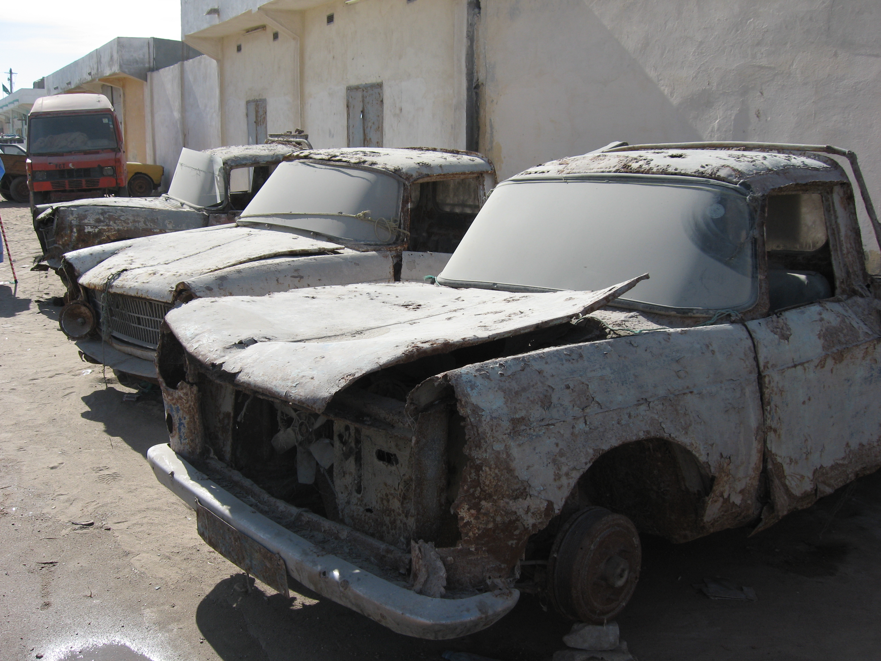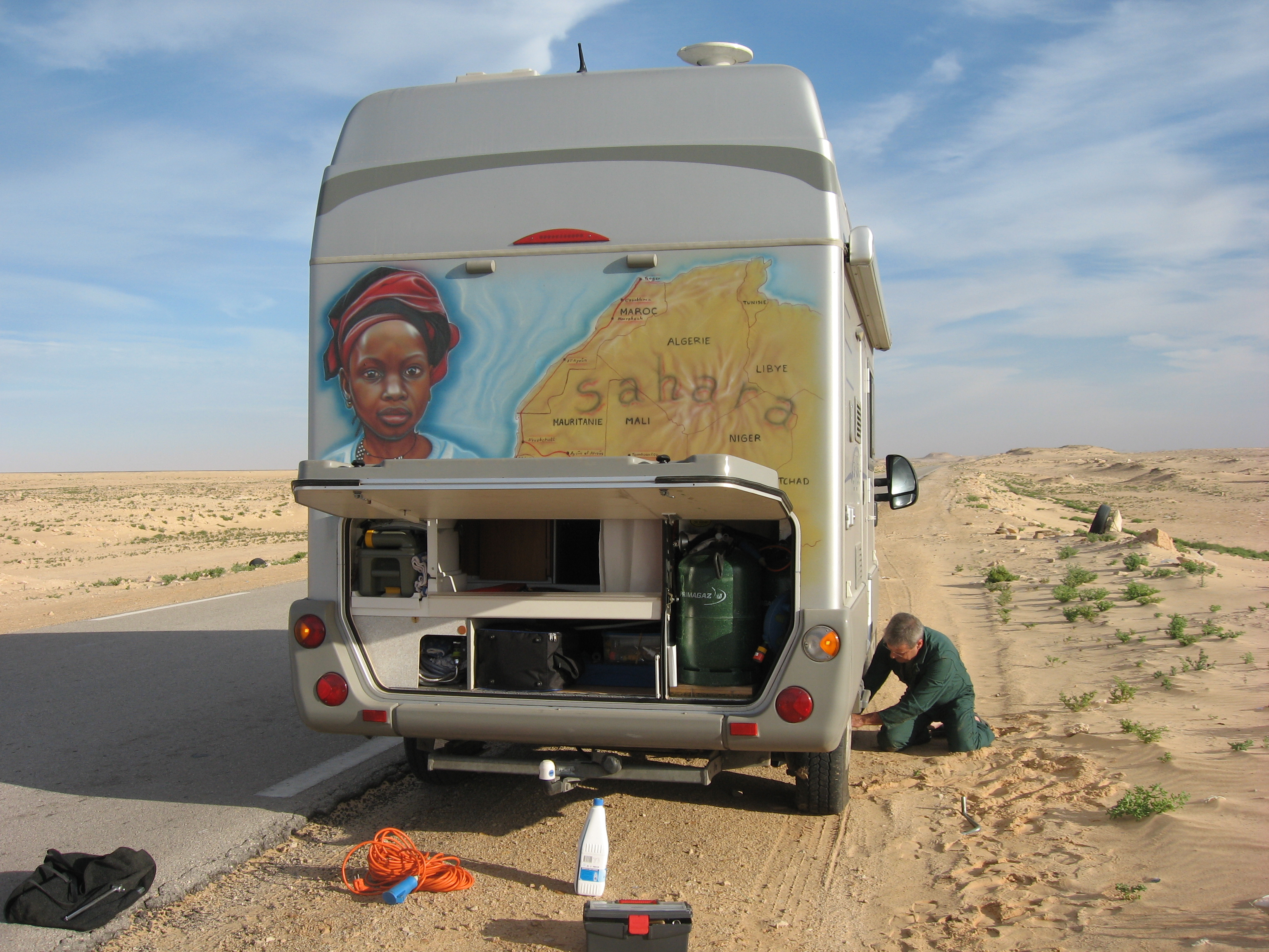 Le trajet s’annonçait simple et tranquille par un goudron plus que correct. Nous doublons une Renault 12 toute en dentelle de rouille. Soudain ! …. CHHHHHH….GOLCGLOCGLOC…. Ah non ! Encore à plat ! Jean-Paul change pour la niéme cette roue pourtant fraichement réparée ! Le vieux Maure en R12 de dentelle nous double en Riant de toutes ses dents… Manquantes ! C’est de bonne guerre l’Ami !