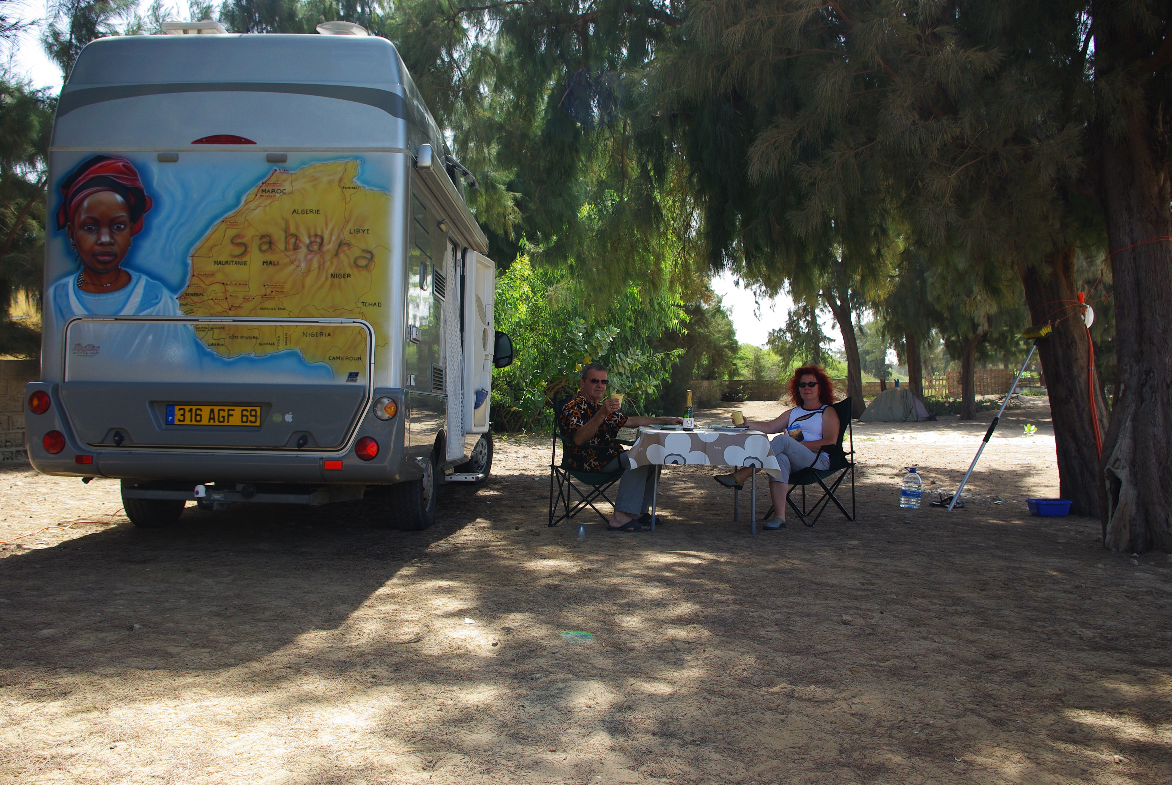 A St Louis, Raymond nous accueille à bras ouvert dans son camping : depuis le temps qu’il n’a plus de camping-cars ! Il nous indique le tuyaux d’eau, les douches. Nous mettrons une bonne heure à sortir les 3 KG de sable embarqués dans le camping-car !!! L’extérieur attendra le lendemain. La douche nous remet sur pied et une bière poussera le sable encore dans nos gosiers. Raymond nous félicitera d’être resté sur le sable : la piste de terre c’est l’enlisement assuré ! Seule la croute superficielle est dure ! J’avais raison d’être têtue !