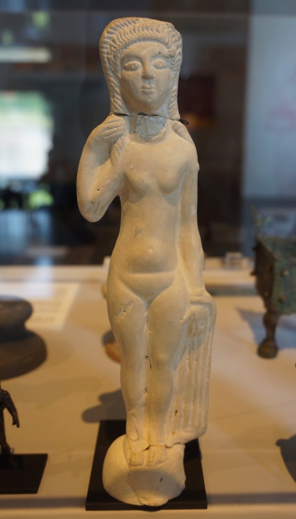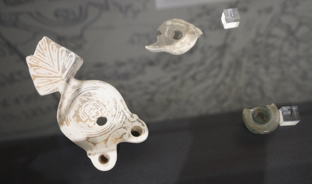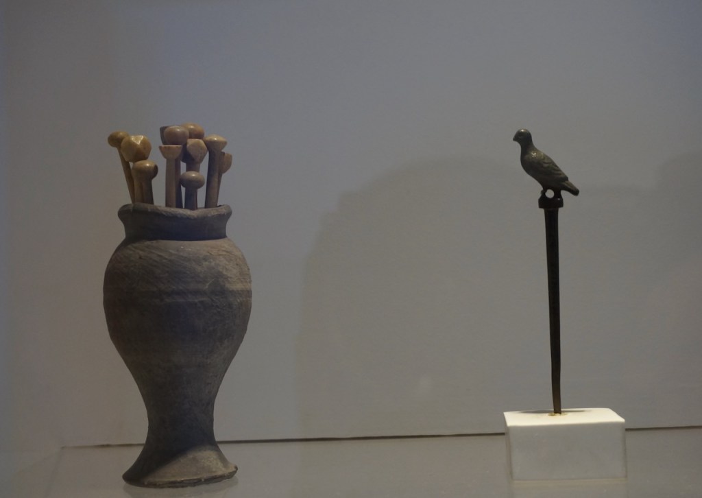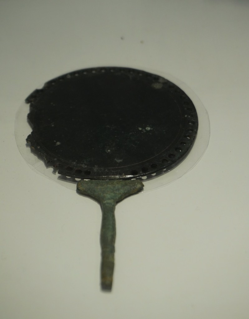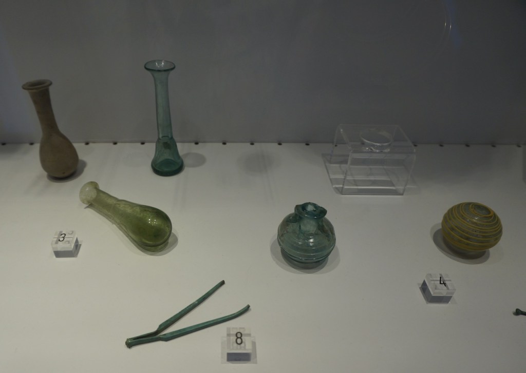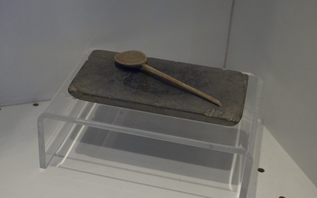 Le nécessaire de toilette de la dame de maison consistait en un beau miroir rond, des pots d’onguents, des boites à bijoux, une palette pour mélanger les fards. Elles étaient très coquettes et utilisaient déjà les végétaux et huiles pour créer des crèmes. Elles aimaient les bijoux.