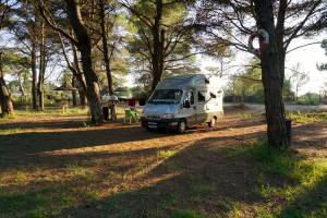 Nous étions pourtant bien hier soir sur le parking d’Apollonia. À 21h, un gardien en gilet jaune nous impose de nous garer dans le site même sur un autre parking. On a du plier l’apéro et la salade vite fait ! Un 4X4 allemand, qui partageait le bivouac avec nous, avait compris qu’il devait se garer à côté de nous. Jean-Paul le détrompe: « Nein. Ferbotten ! Auf !!! » Le 4X4 s’engage en premier et prend une place sur la minuscule plate-forme qui nous est dédiée. LAS ! Impossible de rejoindre la place imposée : l’Exsis patine sur le gravier en pleine montée et virage à angle droit. Le «gilet jaune » ne veut rien savoir… On doit se poser ICI ! Je lui réponds fermement en italien que nous sommes trop lourd et que nous irons sous l’olivier en contre-bas. Il s’entête et nous aussi. Jean-Paul fait « fumer » le gravier…Et finalement…