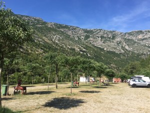 Nous voici pour l’étape en Bosnie, à Stolac, dans un mini camping, au comité d’accueil en gants blancs. Un jeune chien nous fait des fêtes et ne nous quitte plus.