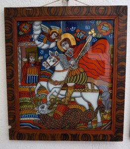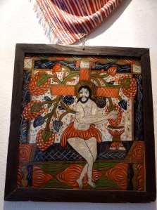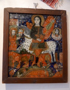 Nous dirigeons nos pas vers l’église St Treime, construite en 1765. A cette époque, la foi orthodoxe était bannie de Transylvanie. Les habitants ont donc érigé une façade catholique. La porte est close…Nous traversons le cimetière et rejoignons le musée des icônes sur verre. Il a été créé par un prêtre, Zosim Oancea, qui venait de passer 15 ans en prison pour avoir protesté contre le régime communiste ! Les icônes sur verre se sont développées à partir de 1700 grâce à des paysans qui ne pouvaient pas s’offrir des icônes sur bois. Elles retracent des éléments de folklore : Marie est habillée comme les femmes des diverses régions de Roumanie, St Georges comme les hommes. Marie protège les pièces d’habitation et St Georges les maisons. Plus de 700 icônes sont regroupées au musée.