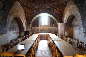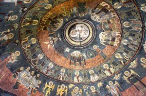 Nous restons les derniers visiteurs avec la gardienne, qui nous abandonne pour frotter sa lessive, laquelle trempe dans une bassine dans la cour du musée. Tout à coup, elle nous entraine dans l’église. Elle en détient la clé ! A l’intérieur, nous découvrons les mêmes fresques que celles du monastère du Mont Athos en Grèce, ceci parce que le fondateur de l’église venait du Mont Athos. Passées de mode, ces fresques avaient été recouvertes de chaux. A la faveur de travaux, elles ont été découvertes pour le bonheur de nos yeux !